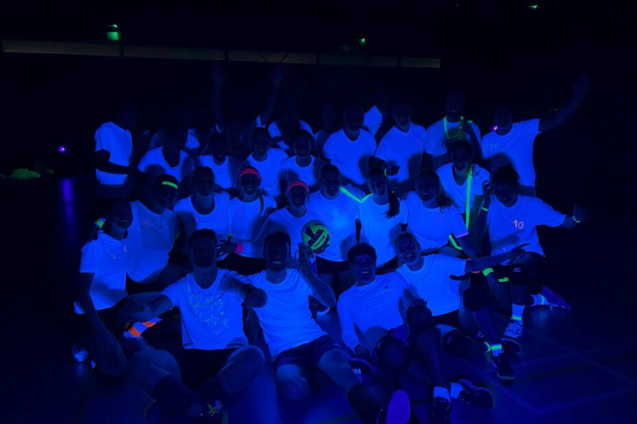 Het begon te schermen rond 16:00 dus daar gingen we, de mini’s mochten als eerst. Voordat ze begonnen met het volleyballen kon eerst iedereen hun shirtje onder tekenen met de glow in the dark stiften. Ook het lichaam werd niet bespaard en mocht ondergekliederd worden met fluorescerende schmink. Het was eventjes wennen zo in het donker volleyballen maar de mini’s waren allemaal erg enthousiast.